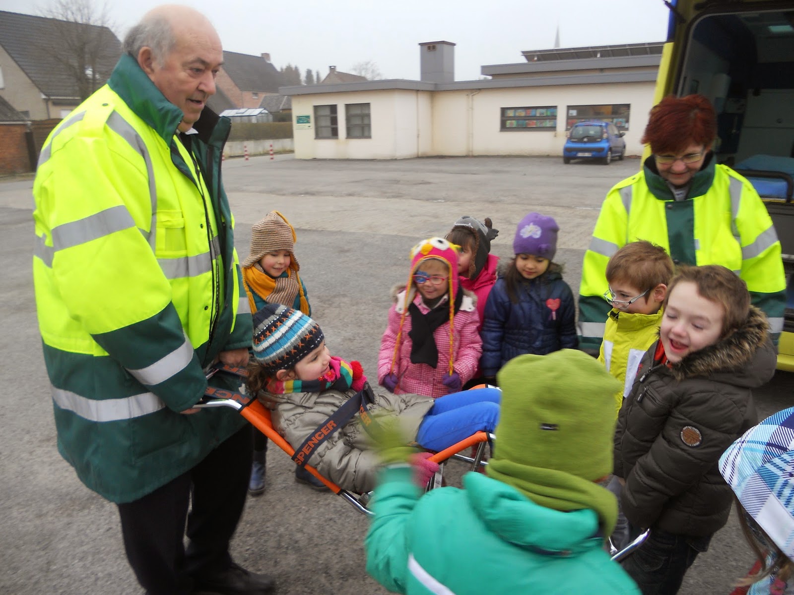 Op vrijdag mochten we een kijkje nemen in een echte ziekenwagen. Juf Lea en Herman van het Levenskruis kwamen naar onze school.